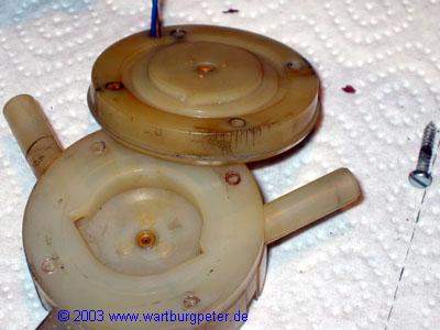Da die Dichtheit des Gehäuses nicht mehr gegeben war, also alles zerlegen, reinigen. Das Gehäuse ist aus Plastik und hat sich leicht verformt. Insbesondere an den Stellen der Schrauben ist das Material sogar eingerissen. Anschließend alles wieder zusammenbauen und zusätzlich mit Dichtpaste abdichten. |