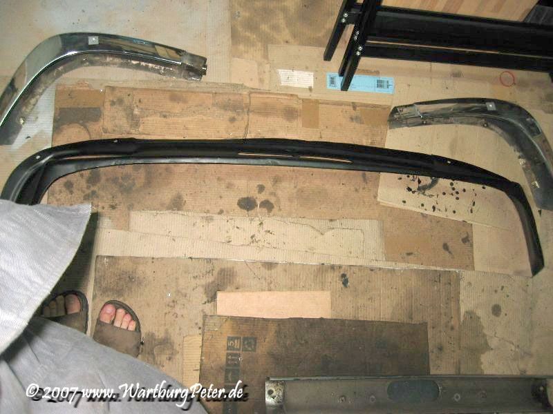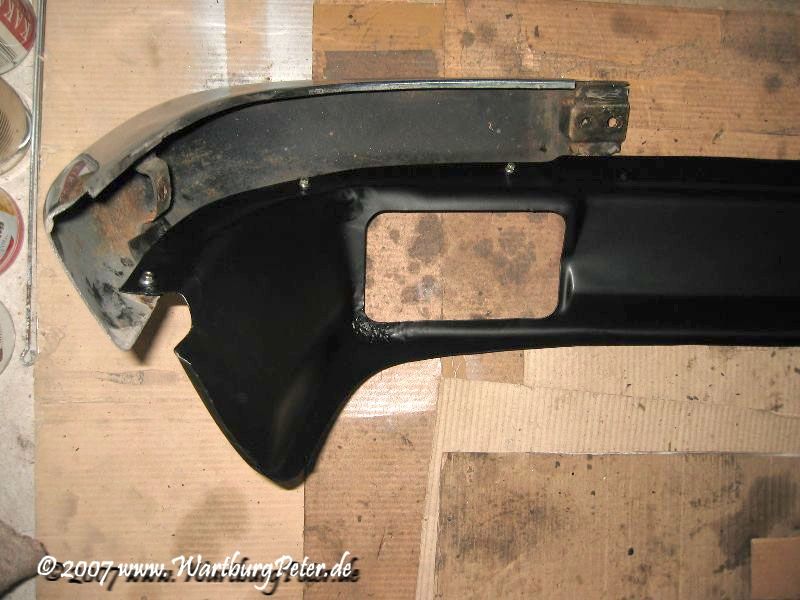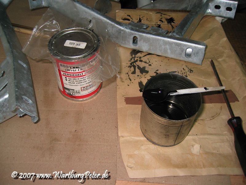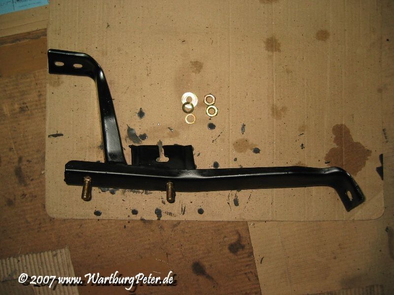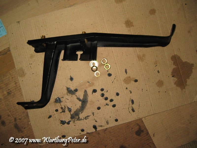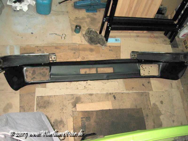Die Stoßstange vorn anzubauen, bildet den Abschluß der Fahrwerksrestauration. Die verzinkten Halter werden ebenfalls mit POR15 lackiert.