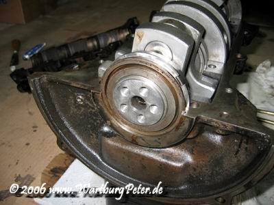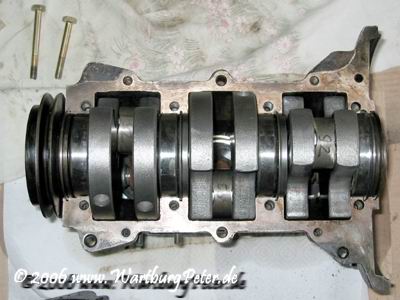 Da ich über Werkzeuge verfüge, um Kolbenbolzen einzusetzen, geht das Einsetzen des Kolbenbolzens in den erwärmten Kolben "butterleicht", ohne Probleme. Ein Verbiegen des Pleuels und Hammermethoden scheiden also aus! Ich bin mit jedem einzelnen Kolben direkt von der Küche in den Keller gegangen, um die Montage vorzunehmen. Wer es darf, kann das ja in der Küche auf dem Tisch machen. Bevor die Kurbelwelle in den Zylinderblock eingesetzt werden kann, sind die Abdichtung auf der Seite der Schwungscheibe und die Keilriemenscheibe zu montieren. Damit ein Helfer die Kurbelwelle festhalten kann, schraubt man am besten auf jeder Seite noch einen Stehbolzen als Griff ein. |