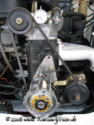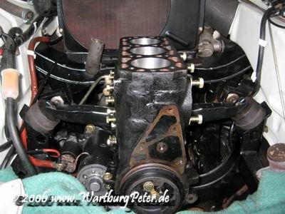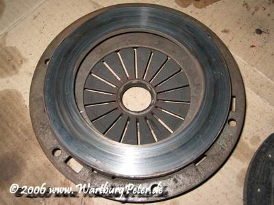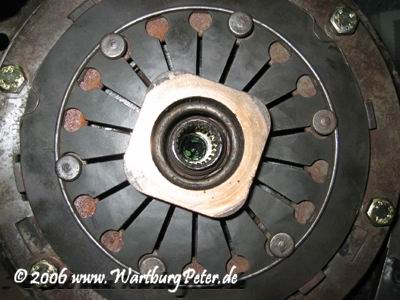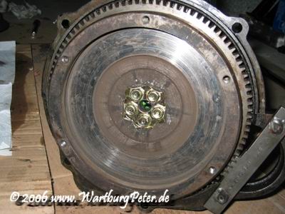 Bevor die Schwungscheibe montiert werden kann, ist das nicht übertrieben gefettete Nadellager für die Getriebeabtriebswelle einzusetzen. Die Schwungscheibe muß wieder in die markierte Richtung (Kolben 1 im OT) gebracht werden, bevor sie verschraubt und gesichert wird. Im weiteren sind dann die Kupplung zu montieren. Ein Zentrierdorn ist hier nicht zwingend erforderlich. Man kann sich auf seinen Tastsinn und Auge verlassen. Ab jetzt kann der Motor direkt im Wartburg plaziert weiter vervollständigt werden. Ebenso kann er vollständig außerhalb des Autos komplettiert werden. Die ersten Kurbelwellenumdrehungen per Hand gehen noch etwas schwer (nicht ohne zu ölen drehen --> Zweitaktöl). Doch dann läuft alles bald recht leicht. |
